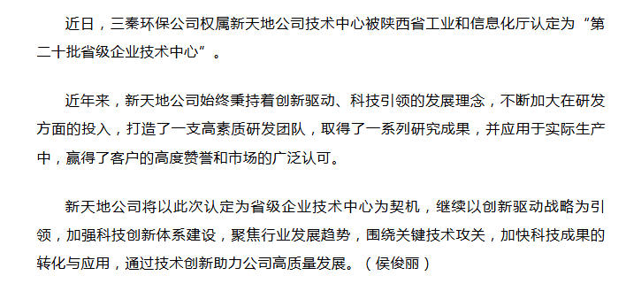 新天地公司技術(shù)中心被認(rèn)定為“省級(jí)企業(yè)技術(shù)中心”